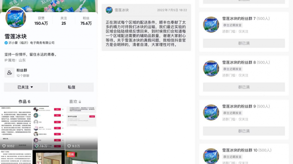 抖音账号上,“雪莲冰块”也发视频回应消费者的热情,“正在积极沟通物流。”然而截至7月5日,“雪莲冰块”的粉丝群里也没有关于如何购买的消息。雪莲冰块粉丝群内的管理员在群内回复,“还在沟通物流中,冷链费用太贵了……”
