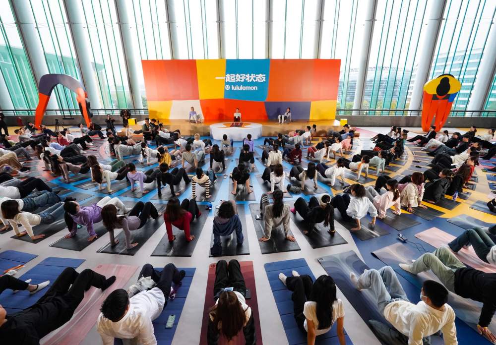 这是11月8日在第八届进博会消费品展区外拍摄的露露乐蒙主办的百人瑜伽活动。新华社记者 杜昕怡 摄