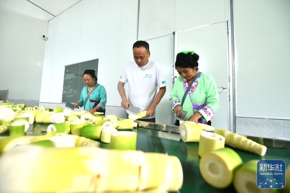 ↑ 在广西柳州市柳江区成团镇六道村一家农业公司生产车间,乌英苗寨妇女梁足英(左)、吴妹富(右)在加工竹笋(6月28日摄)。