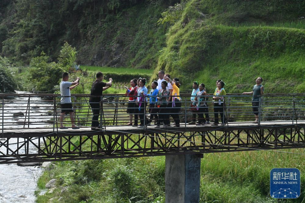 ↑ 在广西柳州市融水苗族自治县杆洞乡乌英苗寨,帮扶企业负责人和村民在拍摄短视频,准备用于推介酸笋金汤(9月27日摄)。