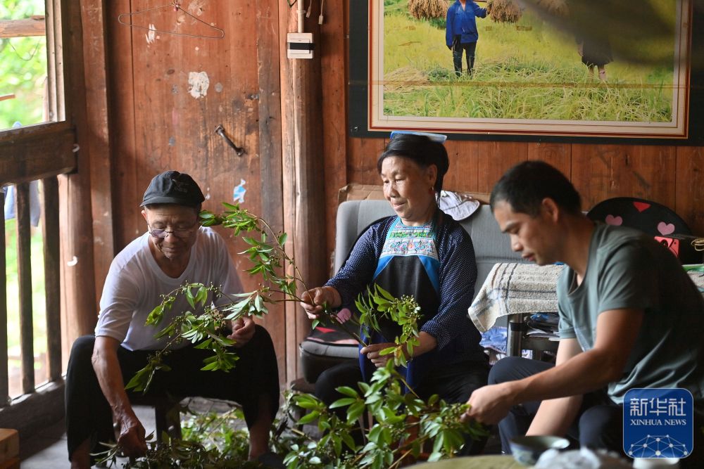↑ 在广西柳州市融水苗族自治县杆洞乡乌英苗寨,村民在整理采收的山苍子,准备送到帮扶企业,用于制作酸笋金汤(7月16日摄)。