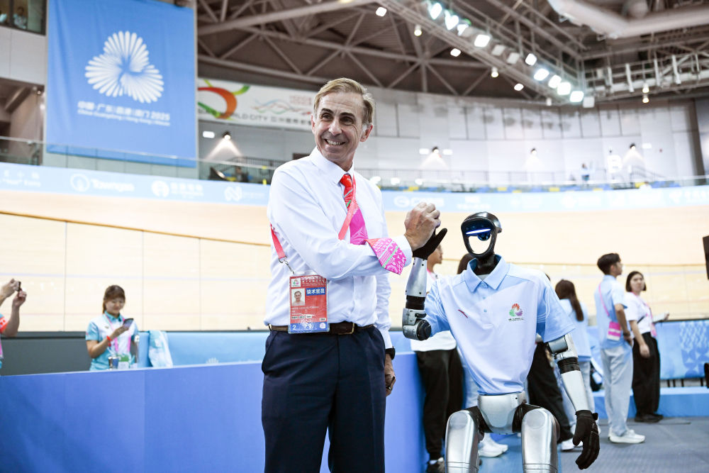11月13日,一名赛事技术官员在场地自行车女子团体竞速赛决赛前同参与表演的机器人击掌合影。
