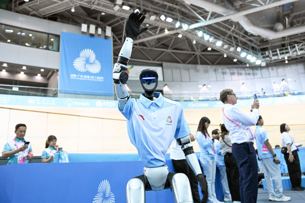 11月13日,参与场地自行车女子团体竞速赛决赛赛前表演的机器人向现场观众招手互动。