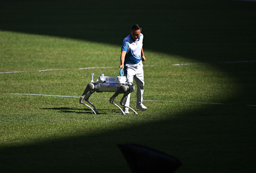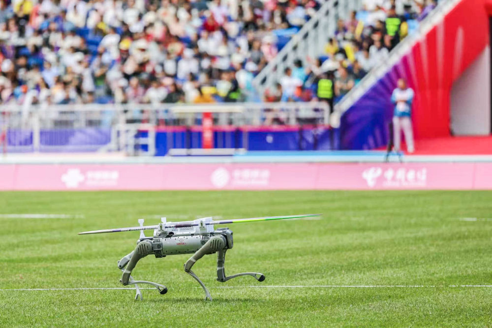 11月15日,机器狗在田径项目女子标枪及格赛中运送标枪。