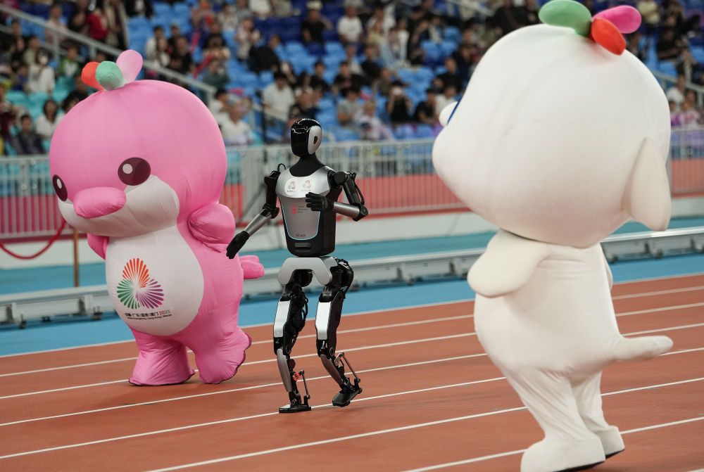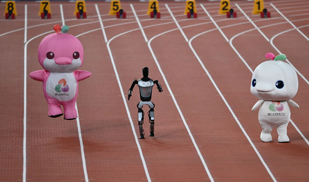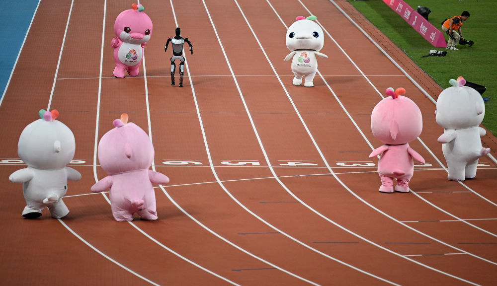 11月17日,在田径项目赛事开始前的暖场活动中,机器人和吉祥物喜洋洋、乐融融在广东奥体中心体育场赛跑。