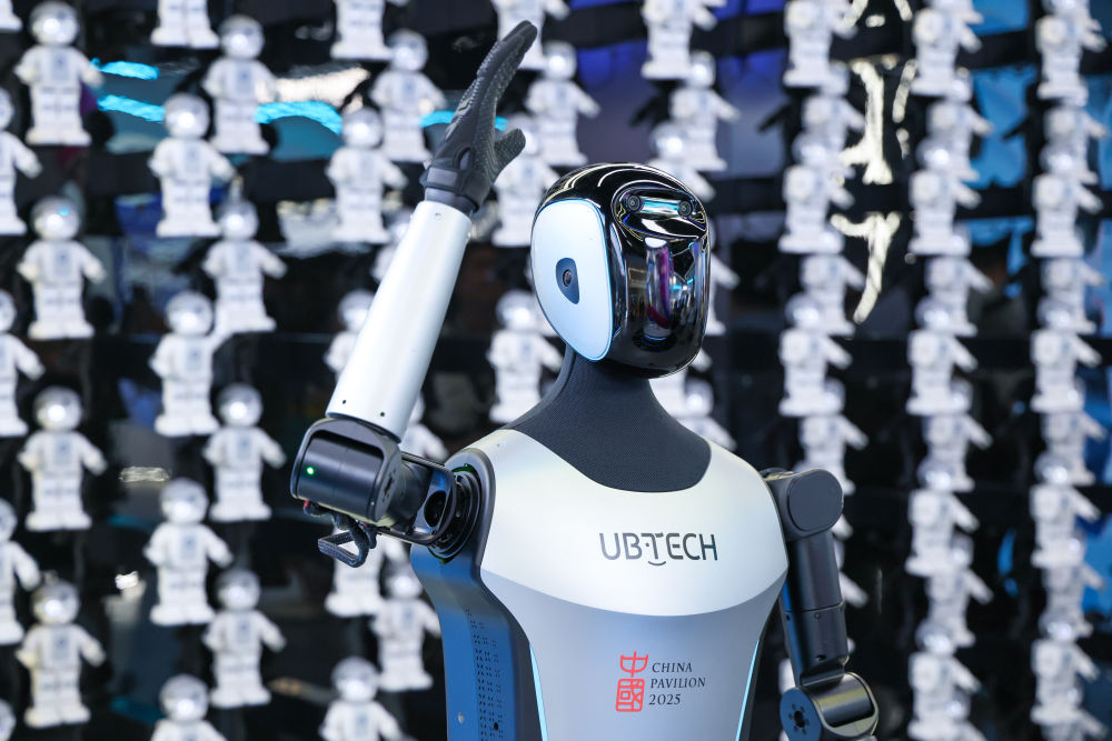 2025年4月23日,在深圳优必选科技展厅内,商用版人形机器人Walker C向观众挥手致意。