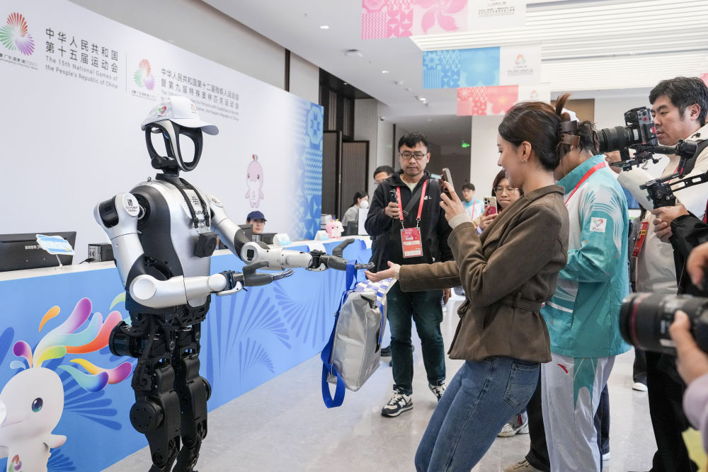 11月19日,人形机器人在深圳赛区分媒体中心为记者发放媒体包。
