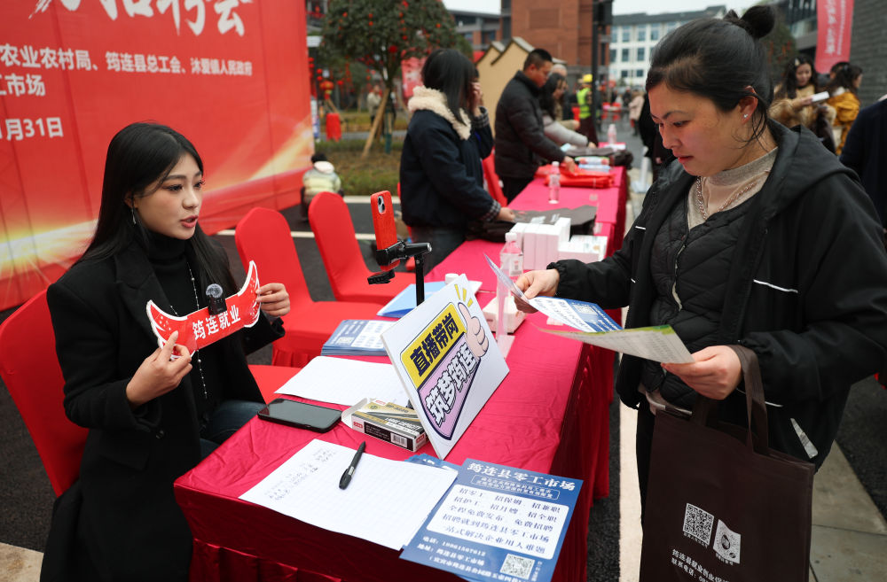 连日来,四川各地相继启动“春风行动”。在宜宾市筠连县沐爱镇金坪村新居文化广场上,一场专场招聘会和直播带岗活动吸引了10余家企业前来,为村民带来280个就业岗位。村民李华聪为自己在家门口就找到了工作感到特别高兴。他说,“很方便,回家的路程很近。”