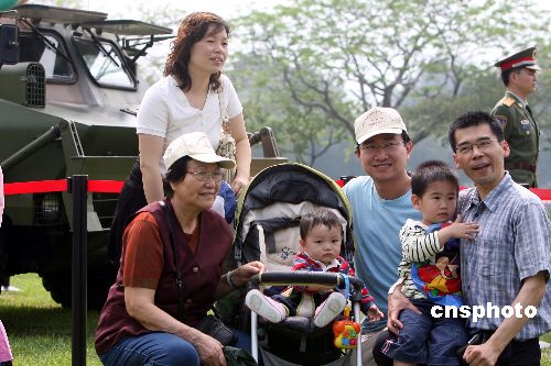 五月一日,中国人民解放军驻香港部队开放了赤柱、昂船洲和石岗三座军营,以庆祝香港回归和驻军进驻十週年,共有一万七千余名市民前往参观。图为市民在石岗军营展出的军车前阖家留影。中新社发武仲林摄
