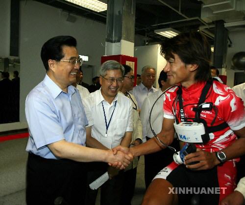 体能训练室里,还有几位正在训练的游泳、空手道、击剑运动员。胡锦涛问一位击剑女运动员在明年北京奥运会上有什么目标,这位女运动员自信地回答:“想拿一块奖牌,最好是金牌!”胡锦涛高兴地说:“好!祝你取得好成绩。”