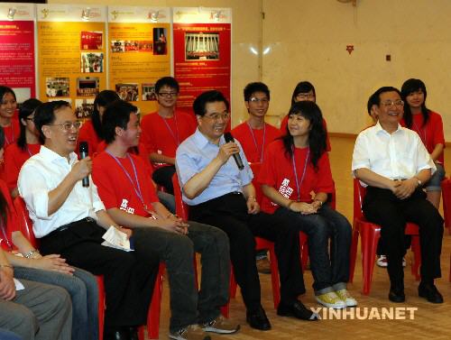 6月29日,国家主席胡锦涛在香港青年新村礼堂同曾经参加“京港同心庆回归迎奥运”访京团的香港青少年座谈交流。新华社记者樊如钧摄 “爱香港、爱祖国” 乌溪沙青年新村大礼堂里张灯结彩,到处欢声笑语,气氛十分热烈。