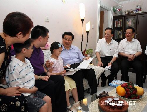 6月29日,国家主席胡锦涛来到香港马鞍山锦丰苑赵锡明家中同他家人亲切交谈。新华社记者李学仁 摄 “希望你们把自己的事业做得更好” 胡锦涛十分关心香港同胞的生活。离开乌溪沙青年新村后,他又来到两个居民社区,走进普通民众家中看望。