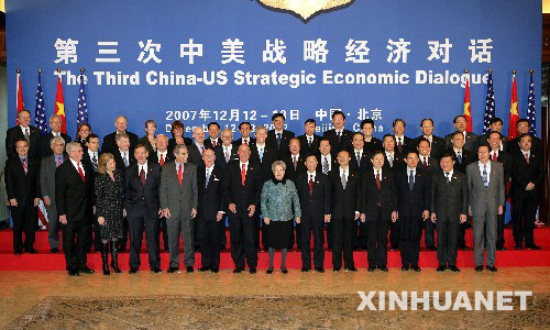 12月13日,第三次中美战略经济对话在北京闭幕。这是闭幕会议前,中国国务院副总理吴仪和美国财政部部长保尔森与双方主要与会人员合影。(新华社记者 高洁 摄)