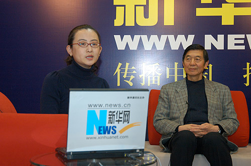 图为2007年12月6日下午14:30,外交学院院长吴建民做客新华网,就中欧关系和新华网友进行在线交流。图为吴建民(右)做客新华网。新华网 张泳摄
