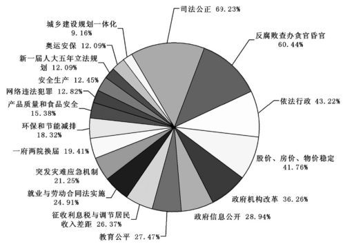 位处网络江湖,不忘庙堂问计。两会之际,网民最关心法治领域的哪些话题?在正义网3月3日开始的网络调查中,截至发稿时为止,广大网民积极参与调查投票。从对18个备选话题的任意选择投票结果看,“司法公正”以69.23%的投票数入选最为关心的话题,“反腐败查办贪官昏官”以60.44%的票数紧随其后,“依法行政”、“股价房价物价稳定”、“政府机构改革”分别有43.22%、41.76%、36.26%的票数。