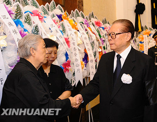 8月31日,华国锋同志遗体在北京八宝山革命公墓火化。胡锦涛、江泽民、吴邦国、温家宝、贾庆林、李长春、习近平、李克强、贺国强、周永康等前往八宝山最后送别。 这是江泽民与华国锋亲属握手,表示深切慰问。 新华社记者李涛摄