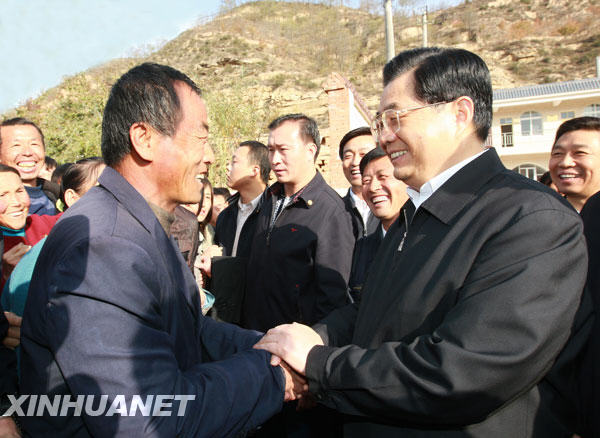 2008年11月17日,中共中央政治局常委到深入学习实践科学发展观活动联系点调研。10月29日至31日,中共中央总书记、国家主席、中央军委主席胡锦涛在陕西省安塞县调研和指导深入学习实践科学发展观活动。这是胡锦涛在他曾经到过的安塞县沿河湾镇侯沟门村同村民亲切交谈,热情勉励他们发展农村经济、创造美好生活。新华社发