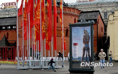 4月24日,莫斯科红场附近的街头装饰一新,准备庆祝反法西斯战争胜利65周年。据悉,今年俄罗斯庆祝胜利日的初步预算为12亿卢布。中新社发 田冰 摄