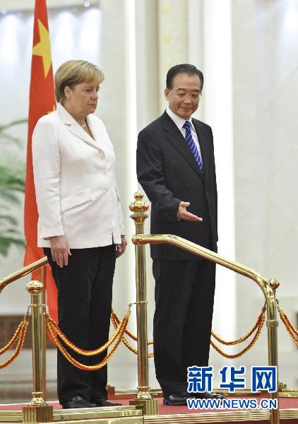 7月16日,中国国务院总理温家宝在北京人民大会堂举行仪式,欢迎德国总理默克尔访华。 新华社记者 黄敬文 摄