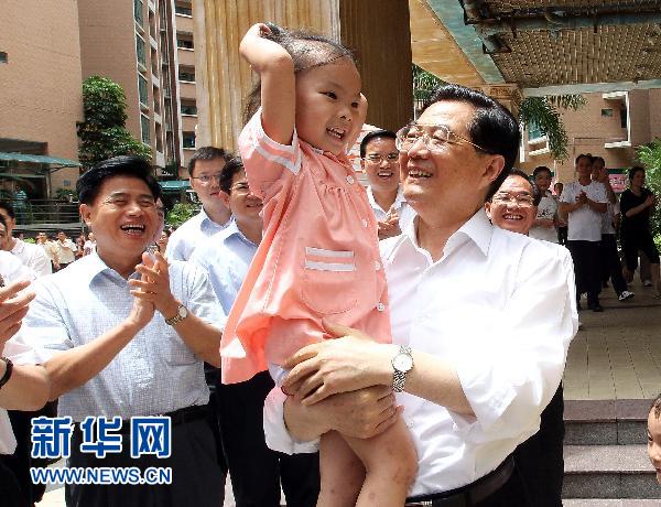 9月4日至6日,中共中央总书记、国家主席、中央军委主席胡锦涛在广东深圳考察工作。这是9月5日,胡锦涛在罗湖区南湖街道渔民村考察时同一位小朋友在一起。新华社记者鞠鹏摄