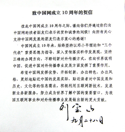 刘云山在贺信中表示,希望中国网发挥优势、开拓创新,办出特色、办出风格,更好地贴近中国的发展实际,贴近读者对中国发展和历史、文化等的信息需求,积极利用互联网新技术,发展新业务新服务,努力成为世界了解中国的重要窗口,为我国互联网事业和对外传播事业发展做出新的更大贡献。