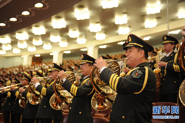 7月1日,庆祝中国共产党成立90周年大会在北京人民大会堂隆重举行。这是军乐队演奏国歌。  新华社记者谢环驰摄