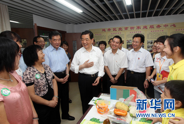 8月11日至15日,中共中央总书记、国家主席、中央军委主席胡锦涛在广东省考察工作。这是胡锦涛在广州市越秀区盐运西社区同居民和社区工作者亲切交谈,了解社区开展便民服务情况。新华社记者兰红光摄