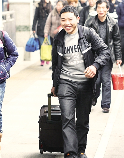 1月13日,成都火车站,从K388次列车下来的一名旅客很开心。