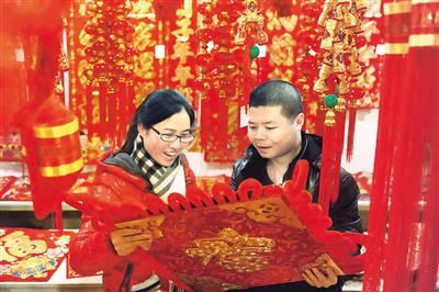 1月20日,在河南省驻马店市宏大市场,在外打工回家过年的邱海波夫妇正选购年货。春节将至,带有年味儿的装饰品受到消费者的欢迎。 本报记者 李景录摄