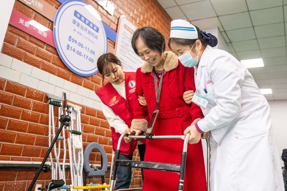 2025年11月6日,志愿者及医务人员在湖南长沙望城区高塘岭街道中南社区帮助行动不便的居民使用康复器具。