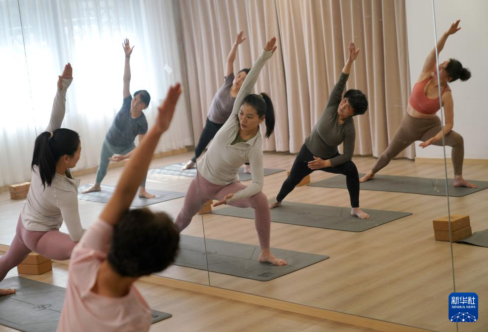3月20日,湾头未来社区居民在社区瑜伽公益课堂上学瑜伽。
