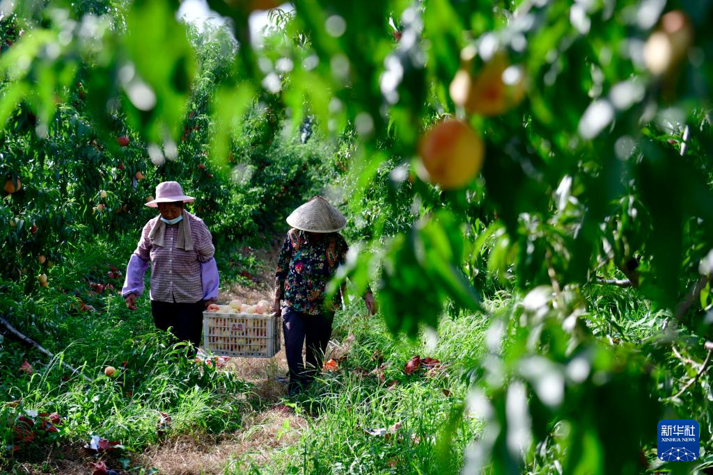 8月10日,在山东省济宁市微山县驩城镇微湖风合作社,村民在抬运桃子。