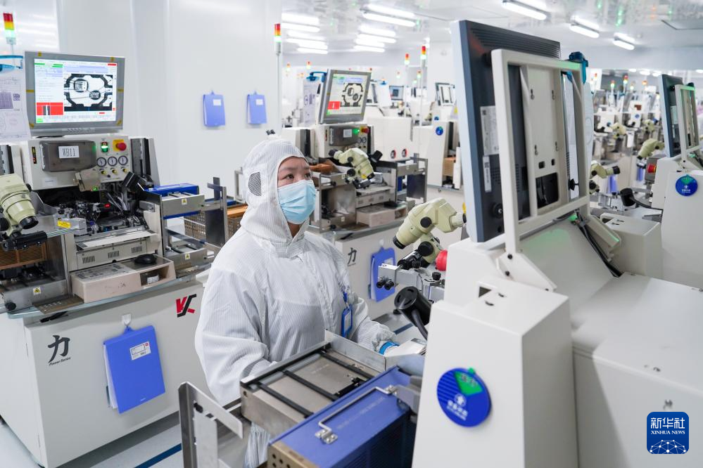 在位于江苏南通如东经济开发区的南通宁芯微电子有限公司,工作人员在装片焊线车间内作业(11月2日摄)。