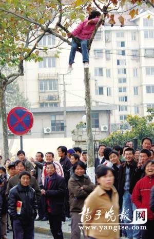 这位妇女是下午3点多钟上的树,然后就不肯下来了,她老公和众多市民就在下面劝,但她只是笑呵呵地俯视下面的众生,也不提任何要求,就是不下来。不久警察也赶到了现场。看到警察来了,那位老公不好意思了,就也爬上了树,想将妻子拉下来,但他妻子坐得很安稳,几个树丫正好卡住她,根本拉不下来。丈夫放弃了“强攻”。警察见苦劝无用,决定智取。警察“威胁”树上的妇女:“你再不下来,我们将你的老公抓走了。”但这位妻子好像并不在意,笑着说:“关我什么事?”这样树上树下僵持了2个多小时。