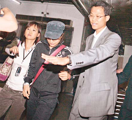 戴上帽子的郭晶晶,在工作人员保护下返酒店。