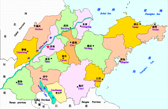 山东省的省会济南市,位于山东省中部,是著名的历史文化名城,因泉水众多,被称为“泉城”。位于山东半岛东部的青岛为副省级全国计划单列市,是著名的海滨城市,也是2008年北京奥运会水上项目的协办城市,是山东省对外开放的“龙头”。