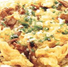 一种做法是将几只鸡蛋,加入些番薯精粉、盐和味精充分搅拌,用勺倒入锅中,摊匀成薄纸状,便成了韧又香的蛋皮。蛋皮即可如北方大饼,卷葱食用,也可切成纸条状,如“粉条”食用。此外,同样是几只鸡蛋,同样是那只勺,只消加入韭菜或葱,然后一次性倒入锅中,便成了金黄色的蛋饼,用小刀划成小块,韭菜碧绿,蛋花金黄。