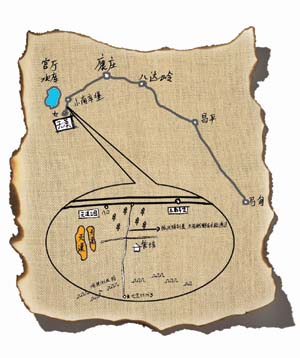 不过由于笔者驾驶的是4X4越野车所以没有选择到天漠公园里面去玩,而是选择了另辟一条天然野路探险,于是在过东花园度假村不到一公里的地方找了条砂石小径开始一路东行。在穿越了一片小树林后沿着土路直逼沙漠腹地,不用两公里就看见右前方一土坡上有四条试车道,据说当年机械部曾在此测试车辆的爬坡性能,于是我急不可耐地也将车开进了沙坡,但想出来时却费了半个多小时的劲。在试验道的左侧(东侧)有一缺口,有条土路一直向南,据观察可达古长城垛口,不远处还有一组断壁,地图上曾是一个古兵营。穿过长城垛口顺着土路再南行1公里多就是龙宝村了,那里有一座经历了80年风霜的老戏台至今还坚持屹立在早已败落的村口。