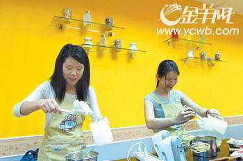这家小店是楼上铺,面积虽小却很有家的感觉。记者日前一个晚上进得店来,六名系着围裙的学员正在上课:在老师的指导下,学员们又是称材料,又是和面粉,又是开烤箱,又是涂果酱……一个个忙得手忙脚乱,但一个个都玩得非常开心。